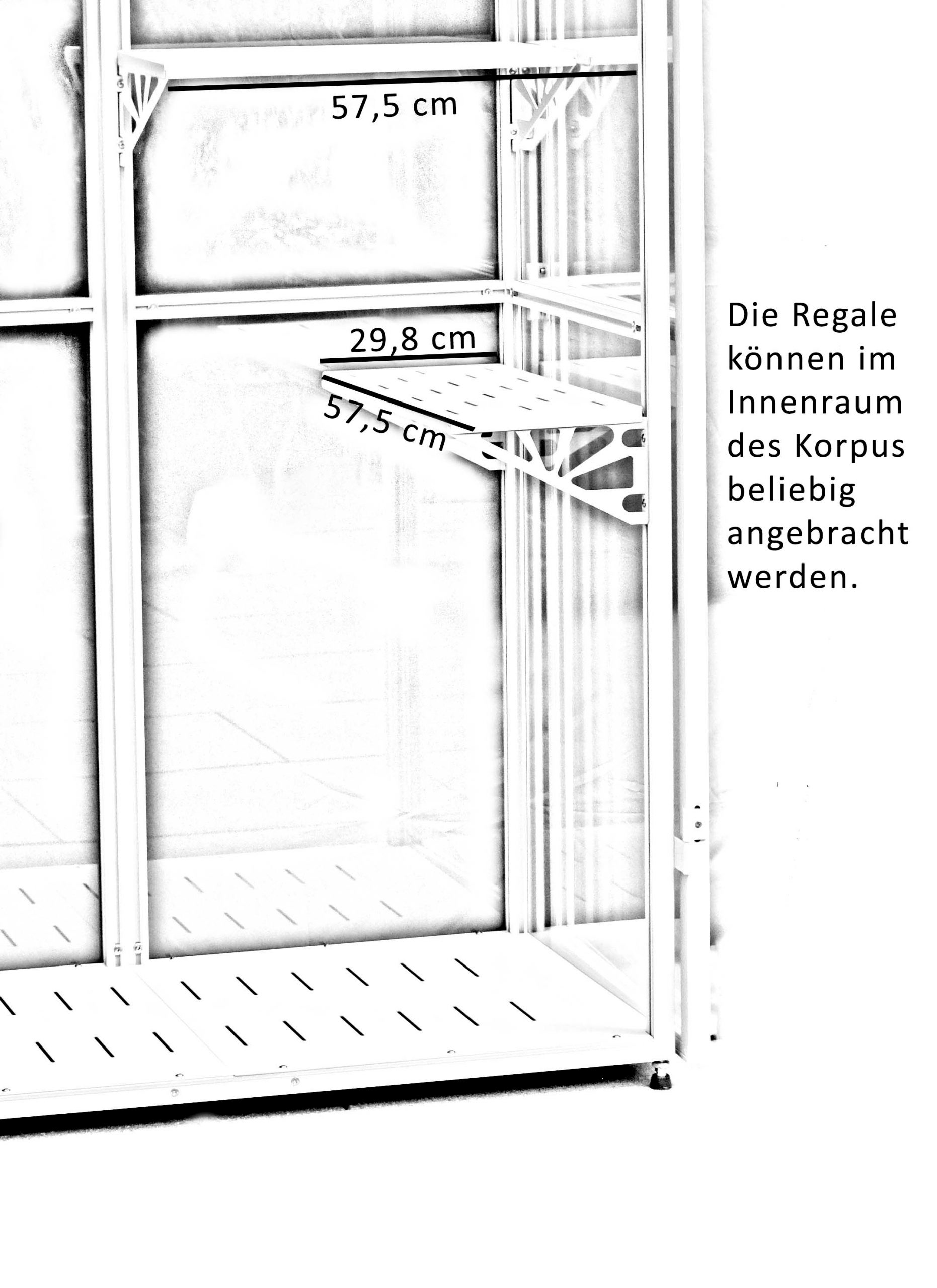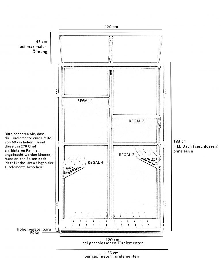 Der Korpus hat eine Höhe von 183 cm. Es gilt zu beachten, dass sich das Dachelement ab einer bestimmten Temperatur öffnet und somit noch mehr Platz in der Höhe berücksichtigt werden sollte (maximal 45 cm).